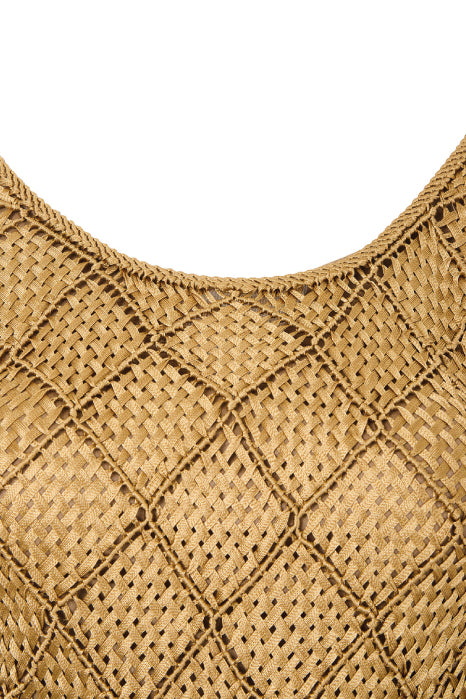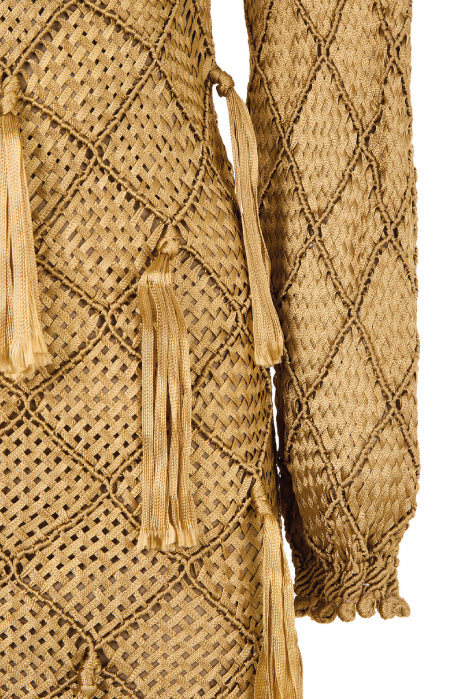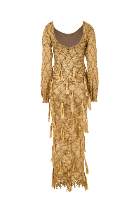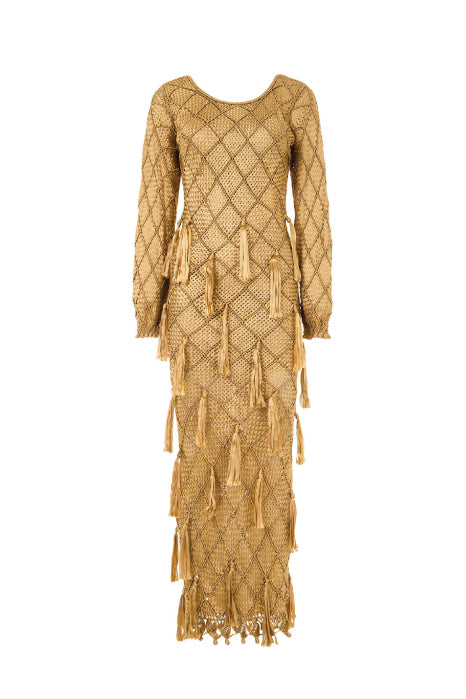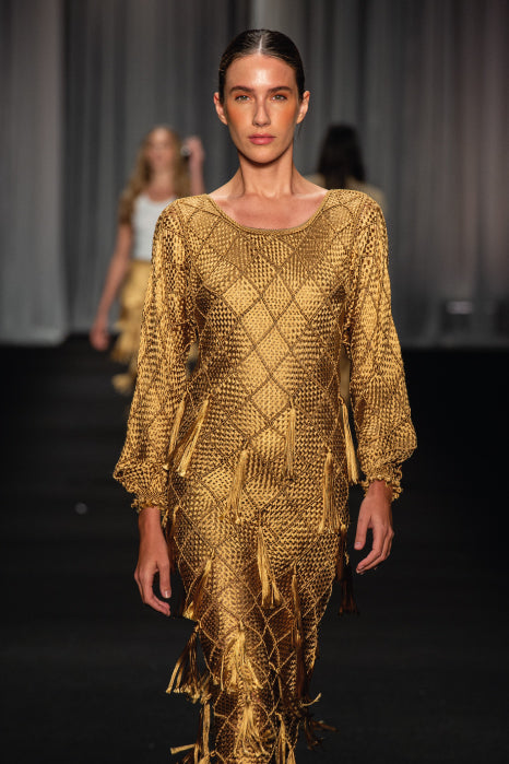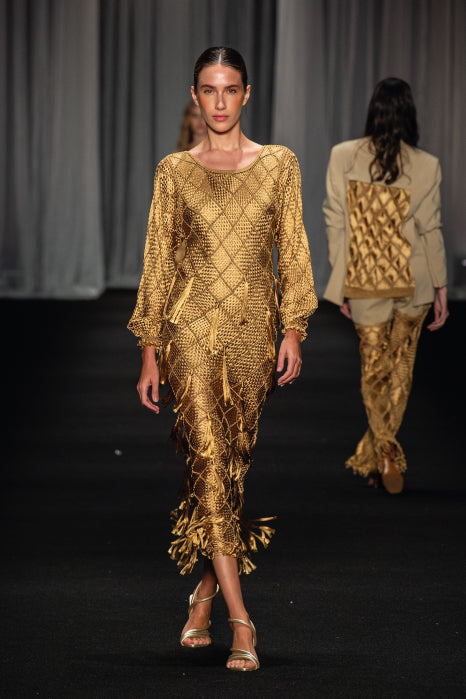 A spectacular piece that stands out with unique finishes and the meticulous craftsmanship behind every detail. Designed with long sleeves, a back neckline, and short fringes that cascade from the waist, its flattering silhouette will make you feel sophisticated and chic. The perfect choice for your special occasions.