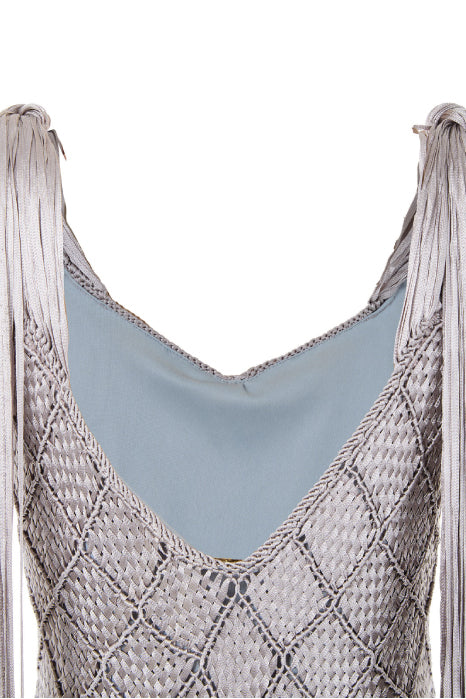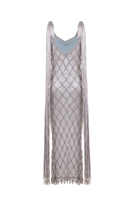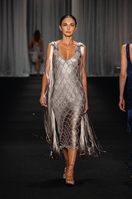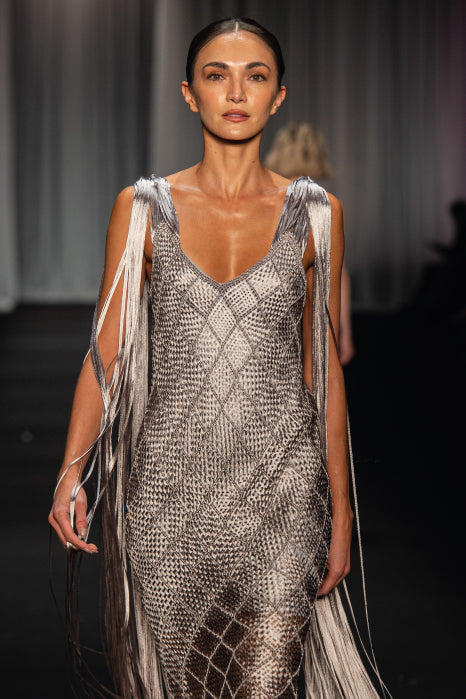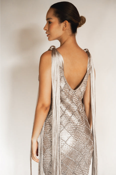 Our Alice Dress, with its ultra-flattering silhouette, elevates your look with seductive fringes flowing from the shoulders. It’s a bold expression of craftsmanship and elegance. This timeless piece is perfect for special, elegant occasions.