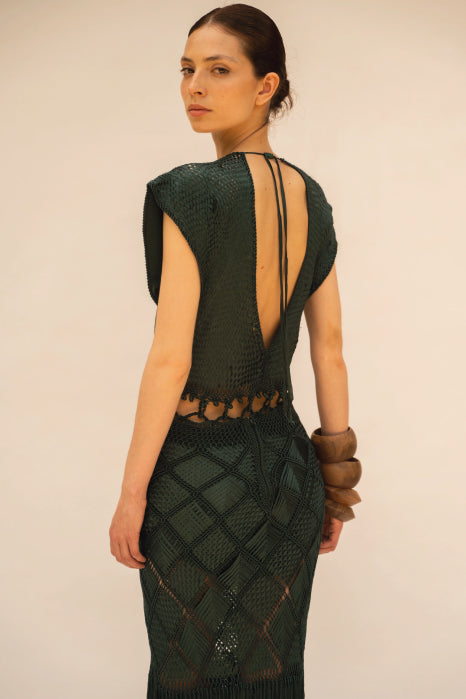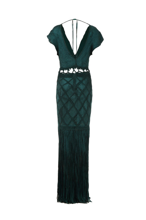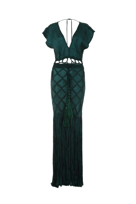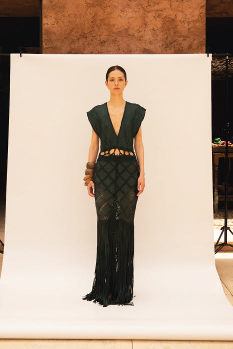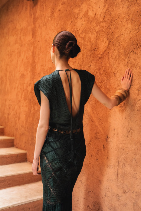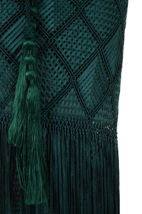 Handwoven in macramé, our Romi dress features a plunging V-neckline and wide sleeves that lend it a relaxed yet sensual feel. Designed with waist cut-outs that subtly reveal the skin and enhance the silhouette, it’s finished with long fringes that add graceful movement with every step.
