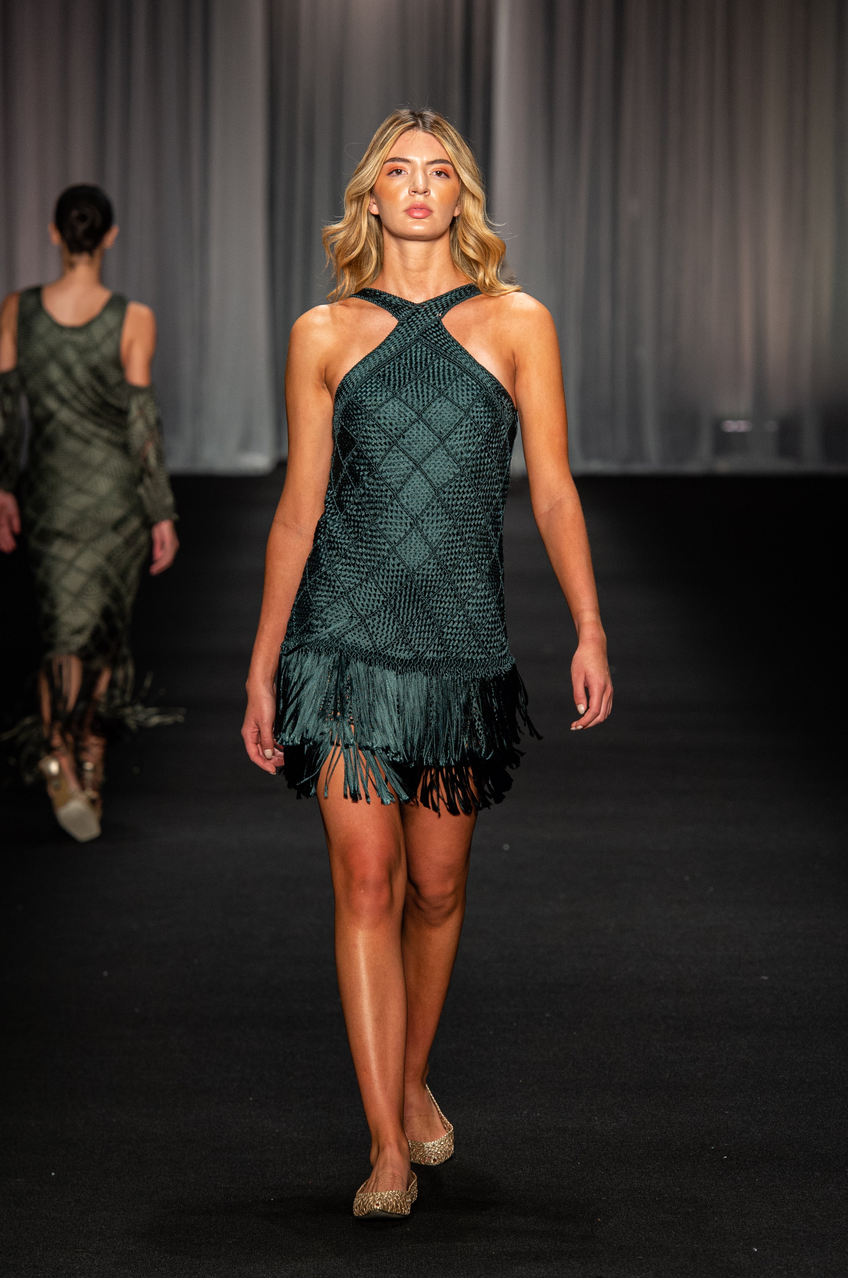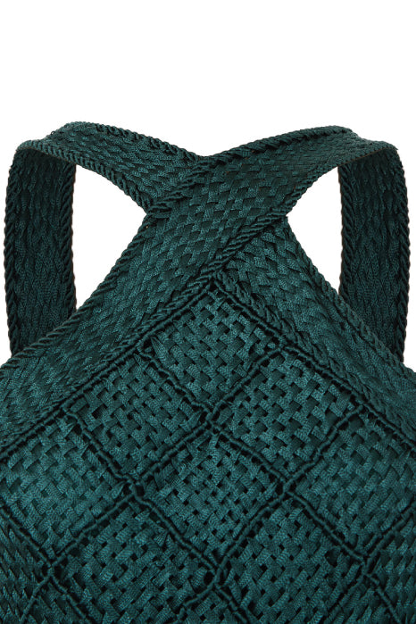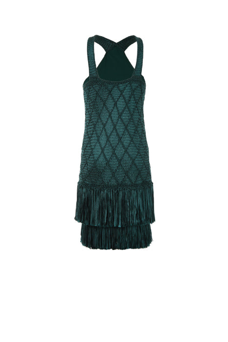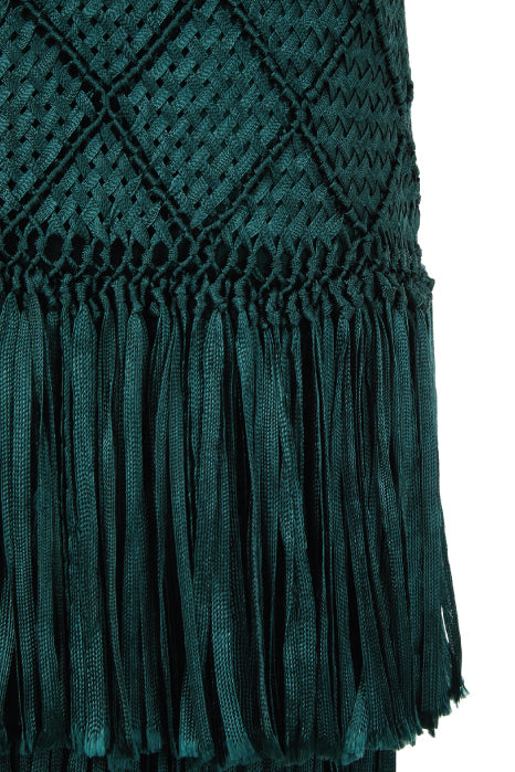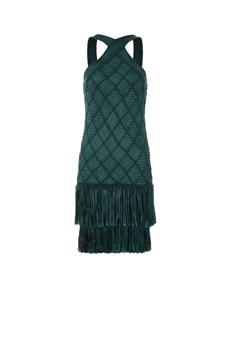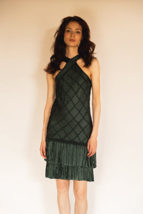 Our hand-woven Ryu dress embodies the essence of youthful femininity. Features a figure-hugging silhouette, crossover neckline, sleeveless design with dangling cascade fringes.